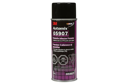 Next, apply aerosol adhesion promoter to the sanded repair area. This is a critical step to ensure the new or repaired tab will remain functional long after repair. Allow the adhesion promoter to cure for 5 to 10 minutes.