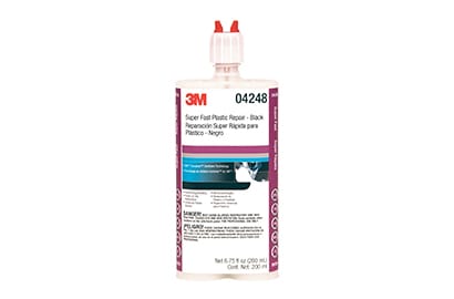 In the next two steps, you will rebuild or recreate the plastic tab using contour film and a fast-curing plastic tab adhesive repair material such as 3M™ Super-Fast Repair Material. For longer work times or if working in hot environments, 3M advises substituting 3M™ Semi-Rigid Repair Material.