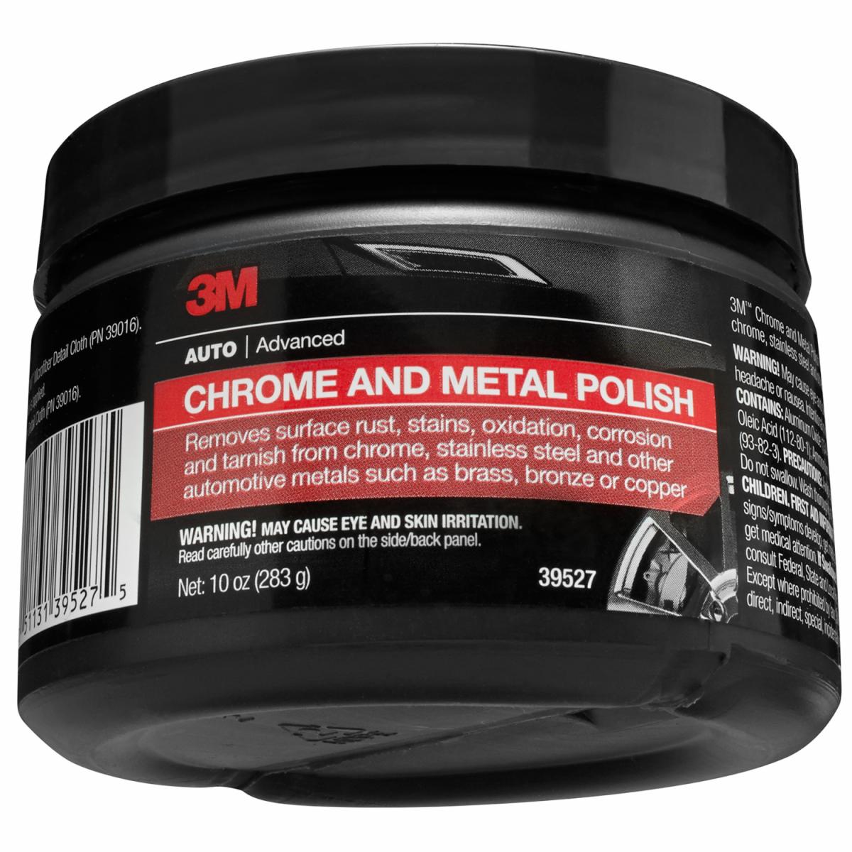 3M™ Chrome and Metal Polish renews the shine and sparkle of metals by removing surface rust, stains, oxidation, waterspots, corrosion and tarnish. This easy-to-use polish brings the beauty back to chrome, stainless steel, brass, bronze, copper and other automotive metals. Use this polish to restore the original gloss and luster of metals on automobiles.